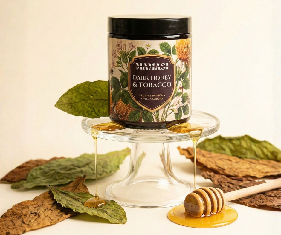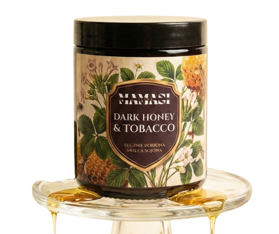 Ręczna Robiona Świeca Sojowa Mamasi „Dark Honey & Tobacco” – Zmysłowe Ciepło (200ml)