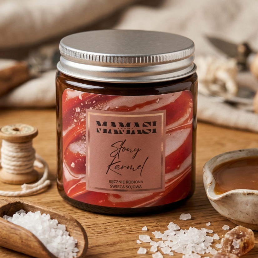Nasze apetyczne zapachy zasługują na najwyższej jakości oprawę. W polskiej pracowni MAMASI każdą świecę rozlewamy ręcznie, bazując w 100% na naturalnym, wegańskim wosku sojowym. Dlaczego to takie ważne? Roślinny wosk spala się w znacznie niższej temperaturze niż komercyjna, ropopochodna parafina. Dzięki temu rozgrzane olejki uwalniają swój karmelowo-słony aromat powoli i równomiernie, a płomień jest czysty i nie emituje toksycznego dymu. To czysta przyjemność, bez absolutnie żadnych wyrzutów sumienia.
