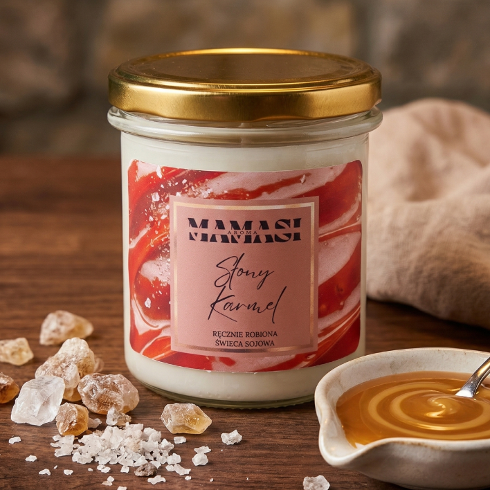 Nasze apetyczne zapachy zasługują na najwyższej jakości oprawę. W polskiej pracowni MAMASI każdą świecę rozlewamy ręcznie, bazując w 100% na naturalnym, wegańskim wosku sojowym. Dlaczego to takie ważne? Roślinny wosk spala się w znacznie niższej temperaturze niż komercyjna, ropopochodna parafina. Dzięki temu rozgrzane olejki uwalniają swój karmelowo-słony aromat powoli i równomiernie, a płomień jest czysty i nie emituje toksycznego dymu. To czysta przyjemność, bez absolutnie żadnych wyrzutów sumienia.